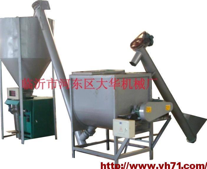 螺旋上料机,双螺带高效混合机,放料机,储料仓,全自动计量包装机,除尘器(选配),控电箱等组成。